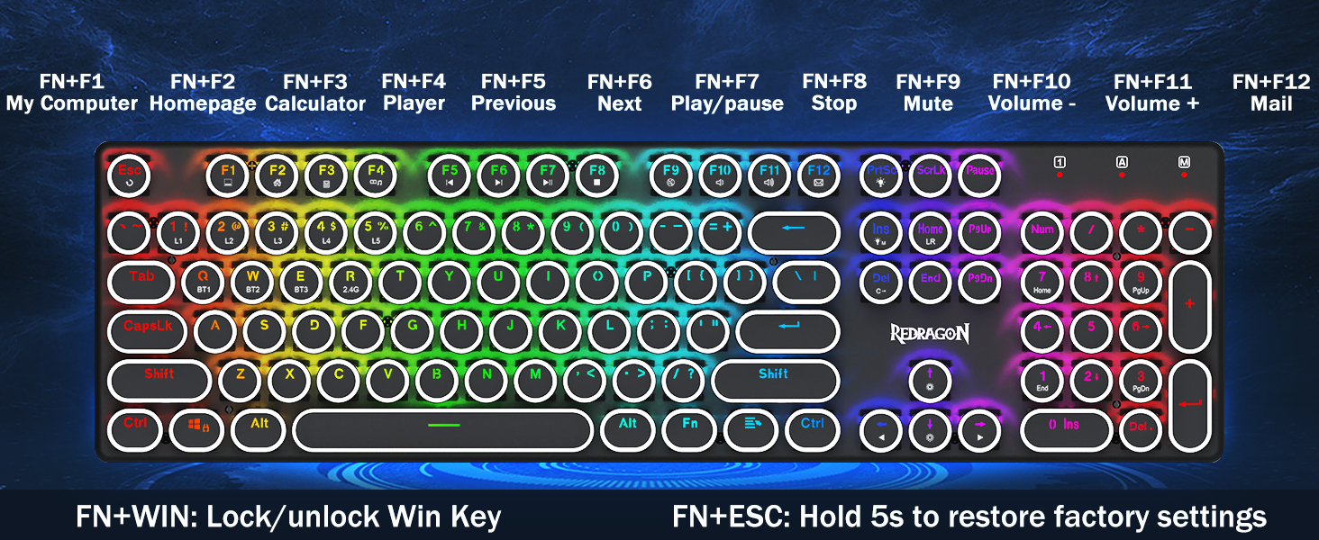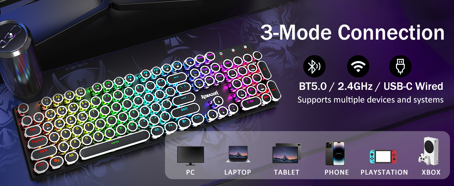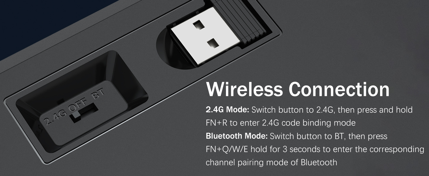 𝟯-𝗠𝗼𝗱𝗲 𝗖𝗼𝗻𝗻𝗲𝗰𝘁𝗶𝗼𝗻 -Бо Технологияҳои Internetuagent Internage, USB-C WESB-C истифода намуд, моделҳои бесими бесим, ки таҷрибаи корбарро дар ҳама соҳаҳо такмил медиҳанд. FN + Q / W / W-ро ба ҳолати Bluetooth пахш кунед, FN + R -ро пахш кунед.