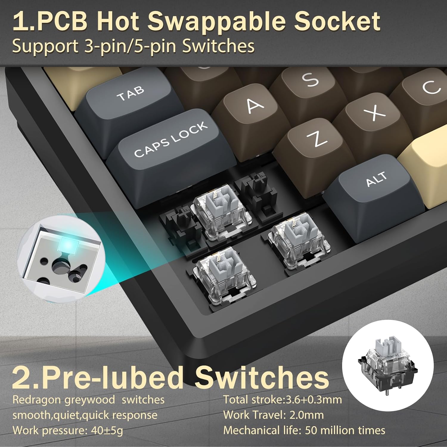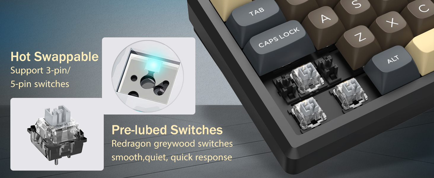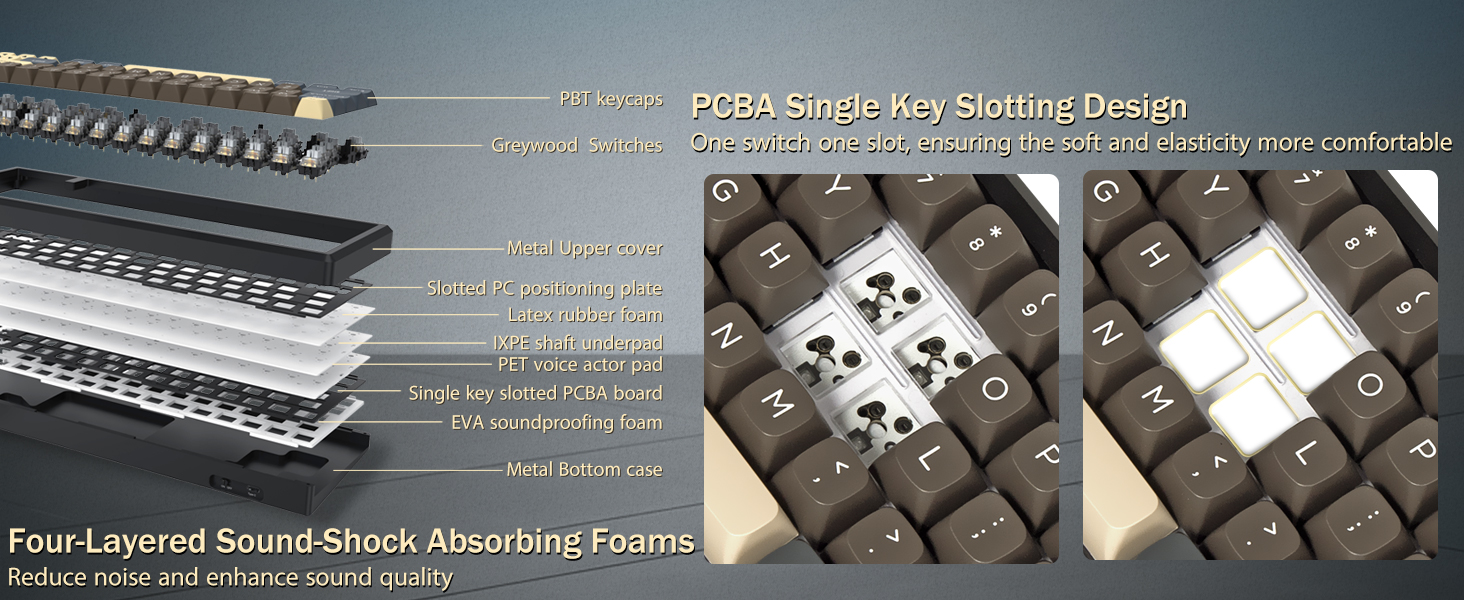 Клавиатура, ки бо коммутаторҳои механикӣ муҷаҳҳаз шудааст, фаъолсозии пайваста ва фикру мулоҳизаҳоро таъмин мекунад. Ин чопкунии дақиқ ва вуруди боэътимодро барои вазифаҳои бозӣ ва корӣ дастгирӣ мекунад.