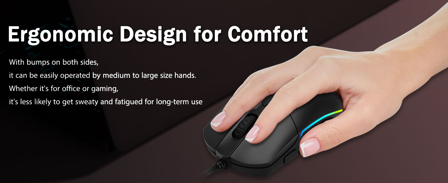 Тасаллӣ- Нишонҳои эргономикӣ дар ҳарду ҷониб мушҳои бозӣро дар ҳама гуна дастҳо ташкил медиҳанд. Он барои бозингарон, бе хастагӣ ҳатто дар соатҳои тӯлонии бозӣ шадидро барои бозингарон, бидуни хастагӣ медиҳад. Он ҳангоми бардоштани муши бозӣ ё зуд ва свитаҳои дақиқ намеёбад.
