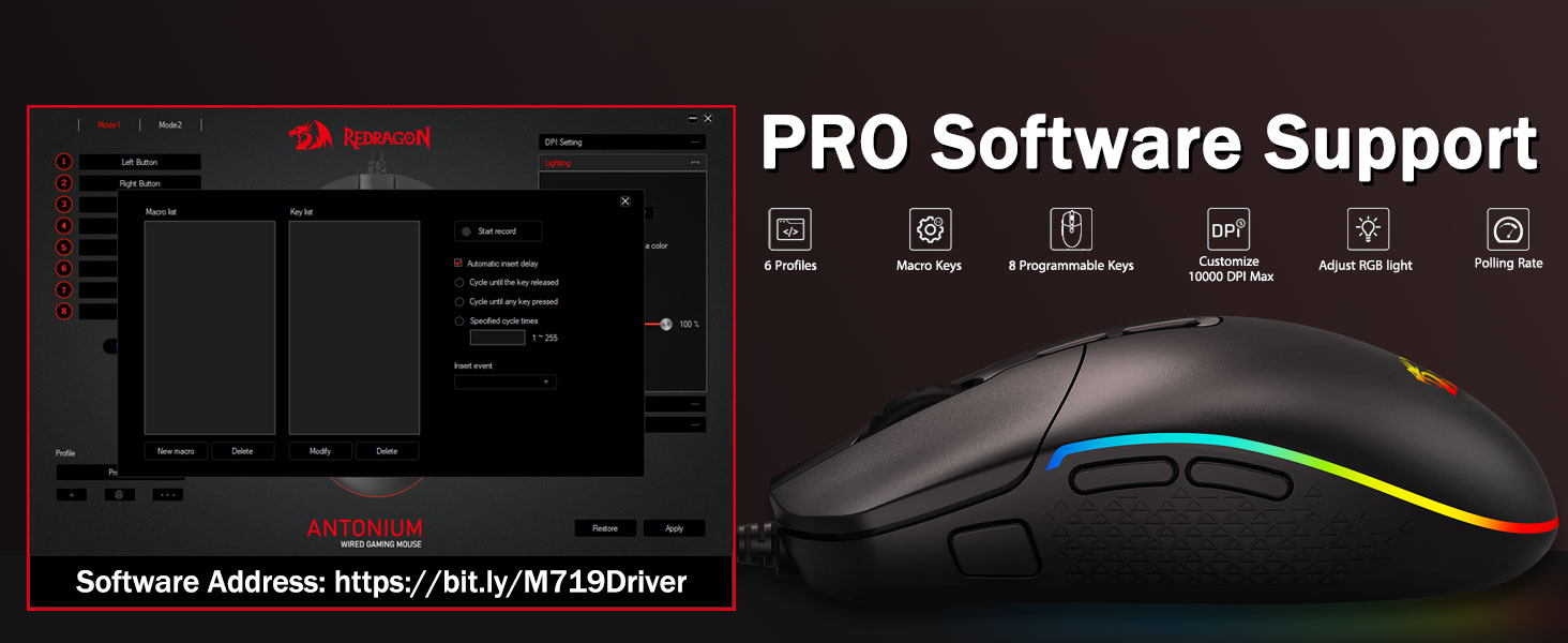 5 Сатҳи DPI DPI ва 4 қурби интихоботӣ- M719 Муш дар сатҳҳои 5 DPI таҳия шудааст: DPI 400/800/1600/2400/4000/4000. Гузариш ба байни ниёзҳои гуногуни бозии гуногун. DPI метавонад озодона ± 100 аз 100 то 10000 тавассути нармафзор барои қонеъ кардани ҳама эҳтиёҷоти шумо танзим карда шавад. 4 Сатҳи овоздиҳӣ танзим карда мешавад: 125хз / 250Гц / 500Гц / 1000Гент, сатҳи баланди интихобот ҳаракати ҳамвор ва тезро таъмин мекунад.