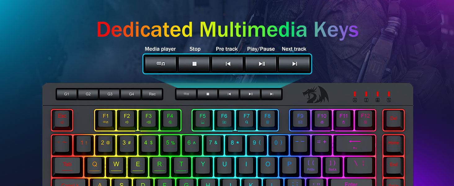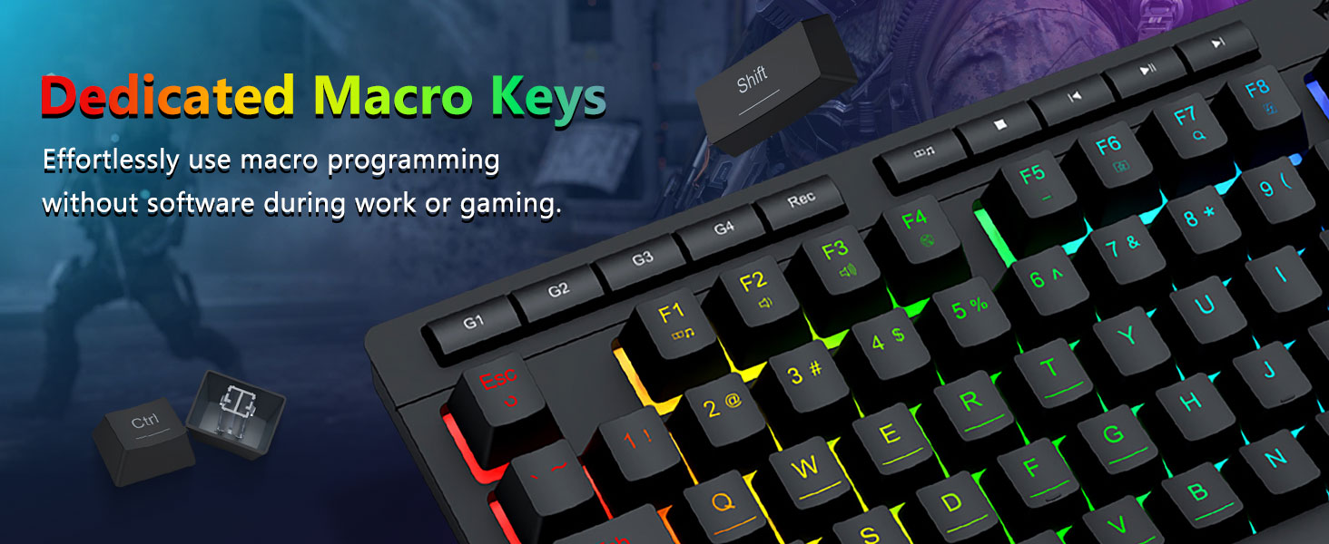【Амнияти самаранок ва қулай】Ин клавиатураи бозӣ ва Combo муш бо 4 дар тахтаи абзор, 5 калидҳои MachIMEDIDIDISIADIADISIADISAL ва 12 тугмаҳои функсияҳои нармафзор ва 12 фанҳои MultImedia, ки барои фаъолиятҳо оддӣ ва қулай мебошанд, муҷаҳҳаз карда мешаванд. Он на танҳо самаранокиро беҳтар мекунад, балки инчунин ҷараёни бозикунии шуморо қулай ва тезтар месозад